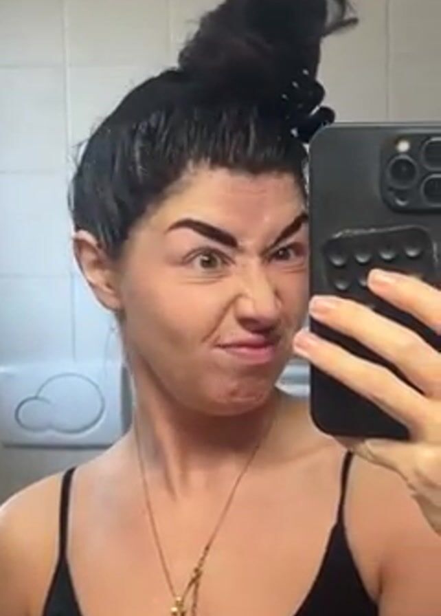 A woman in a bathroom is taking a selfie with a phone. She's wearing a black tank top and a gold necklace with a cross pendant. Her dark hair is styled in a messy bun, held in place with a black claw clip. She's making silly faces at the camera, first scrunching up her face and then smiling. The bathroom has light-colored tiled walls, and a white toilet fixture is visible in the background. The phone has a black case with a textured grip.