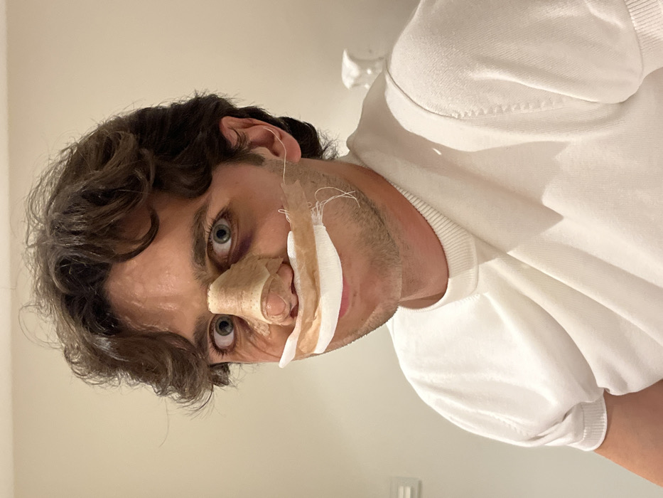 A man with brown, curly hair wears a white shirt. Bandages cover his nose and upper lip, suggesting a recent surgical procedure. His eyes are wide and appear slightly bruised. The background consists of a plain, light-colored wall. The image's angle is slightly tilted.