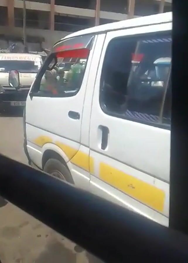 bustling street scene from the perspective of a person sitting inside a matatu, a type of Kenyan minibus