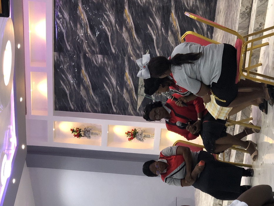 An indoor scene in Weija, Ghana, depicts four women seated on red-backed chairs with gold-colored metal frames, participating in what appears to be a panel discussion or presentation