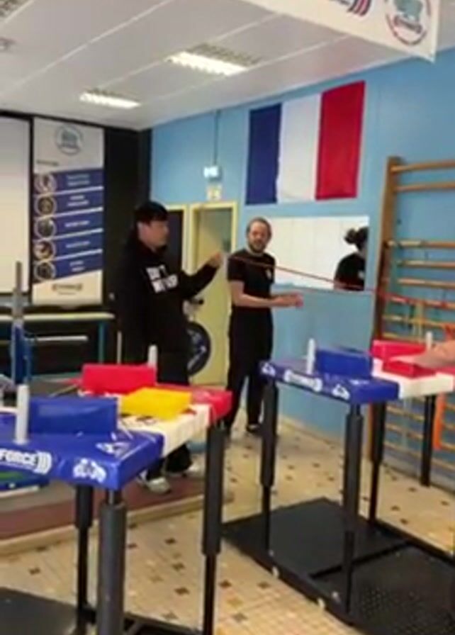 gym with two arm wrestling tables. Two men are standing next to the tables, one holding a red resistance band, stretching it out. A third man stands behind one of the tables, looking down at it. In the background is a French flag and a climbing wall. The room is brightly lit and decorated with motivational posters.