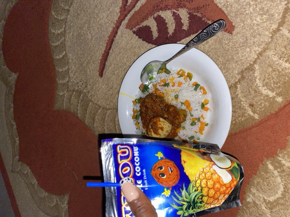 The scene depicts a meal laid out on a patterned carpet in Sabon Tasha, Nigeria. A dark-skinned hand with a light-colored manicured fingernail, featuring a black and white cow print accent on the ring finger, holds a blue and silver pouch drink labeled "OU Pineapple Coconut Fruit Drink." A blue straw extends from the pouch. To the right, a white oval plate contains white rice mixed with diced orange carrots and green scallions. On the rice, a portion of reddish-brown stew is present, containing at least two halved hard-boiled eggs and pieces of what appears to be chicken. A silver spoon with an ornate dark handle design rests on the plate. The background consists of a beige and reddish-brown patterned carpet with abstract curvilinear designs.