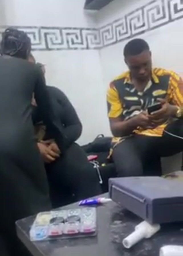 three people in a small room. A person in a long black dress is standing, seemingly adjusting or fixing the dress of another person seated on a chair or couch. A man in a yellow and black patterned shirt sits on a chair to the right, looking at his phone. A table in the foreground has a container of small, shiny objects and a blue case. The room's walls are white with a geometric pattern near the ceiling.