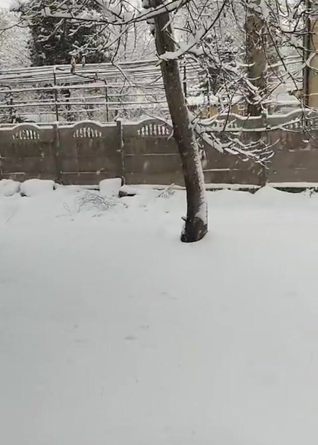 snow-covered yard with a concrete fence in the background. The yard is covered in a thick layer of snow, and it is still snowing. A bare tree stands in the middle of the yard. Behind the fence is a building with windows. There is a metal railing visible on the right side of the frame. The scene is quiet and peaceful.