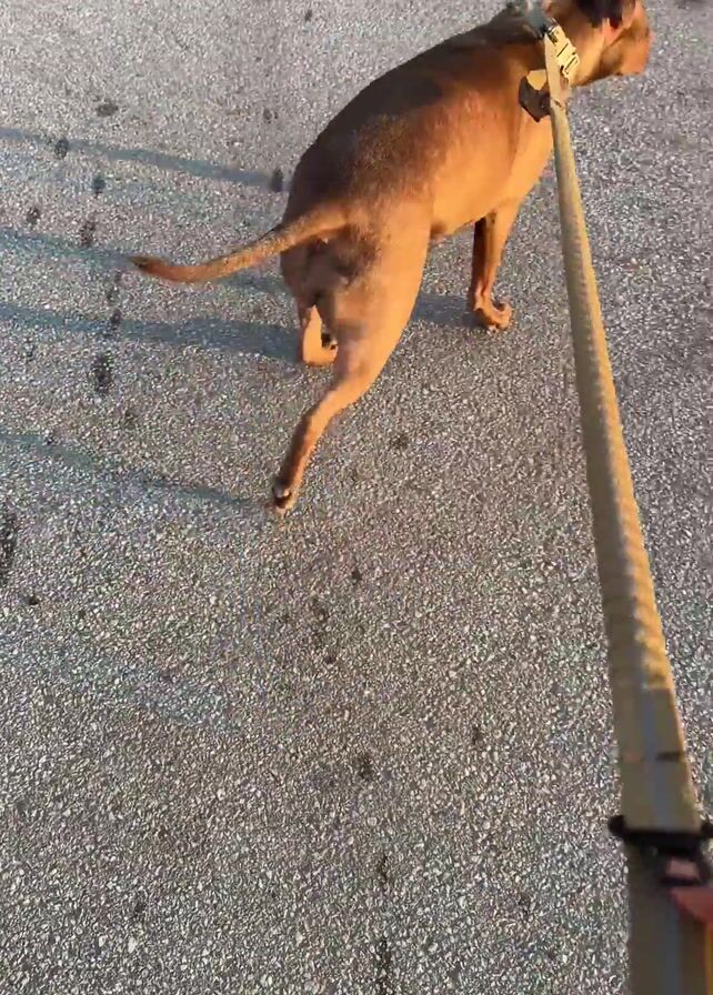 A medium shot from the first-person perspective shows a person walking a brown pit bull type dog on a gray asphalt surface