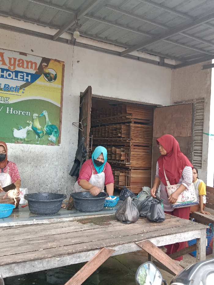 Three women wearing hijabs and masks are working at an outdoor food preparation area. One woman is chopping chicken. Another is washing it in a large black tub. Several bags of prepared chicken sit on the table. A fourth person in a yellow shirt is looking at the scene. The building behind them is lined with wood planks. A faded sign for Ayam OLEH is hanging on the building. A motorcycle is parked in front of the table.