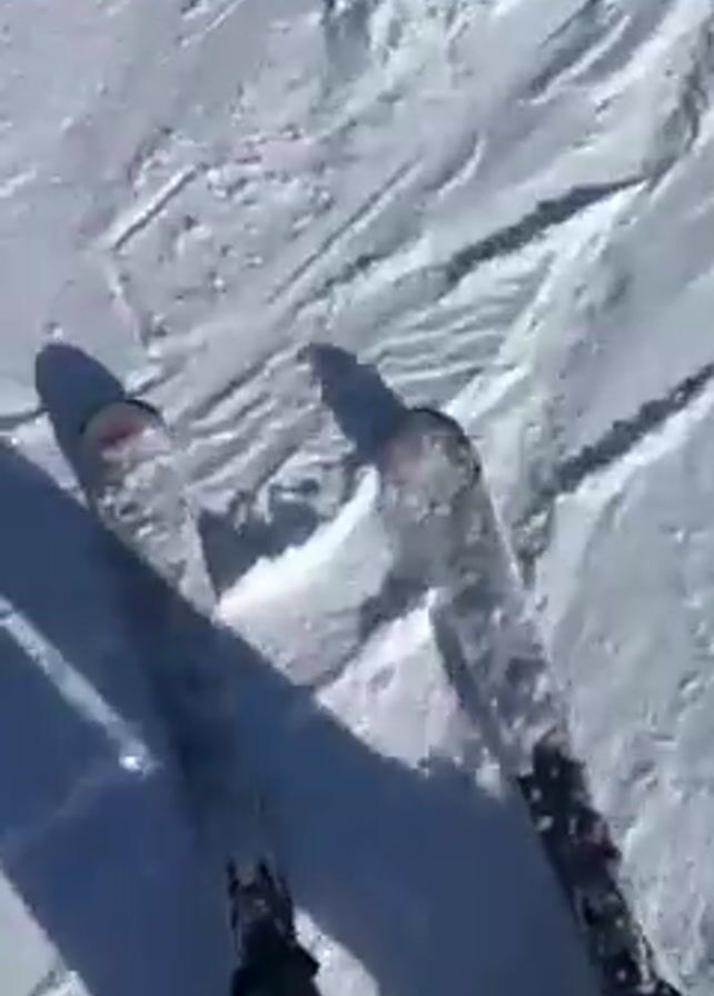 A first-person perspective video shows someone skiing down a snow-covered slope on a bright, sunny day