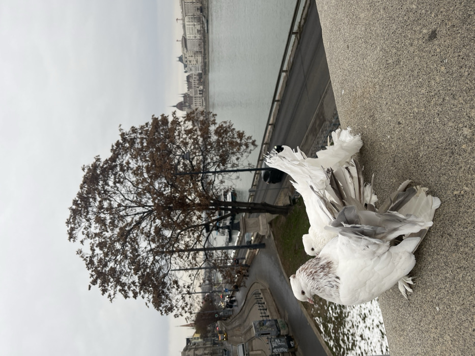 The image depicts a winter or late autumn scene along the Danube River in Budapest, Hungary. In the immediate foreground, two fancy pigeons, predominantly white with feathered legs and ruffled tail plumage, are perched on a grey, textured stone parapet. One pigeon displays reddish-brown speckling on its head and neck, with grey and white tail feathers. Beyond the parapet, a multi-lane road parallels the river, separated by a pedestrian walkway and a retaining wall. Tram tracks are visible to the left, with a yellow tram and several pedestrians present on the sidewalk. A large, deciduous tree with brown, withered leaves stands prominently in the midground. Several light poles are also visible. On the river, two white vessels are docked. Across the Danube River, on the Pest side, the Hungarian Parliament Building is clearly identifiable with its distinctive dome and numerous spires. It is flanked by other urban architecture along the riverfront. The sky above is overcast and uniformly grey. The ground near the parapet shows traces of snow or frost.