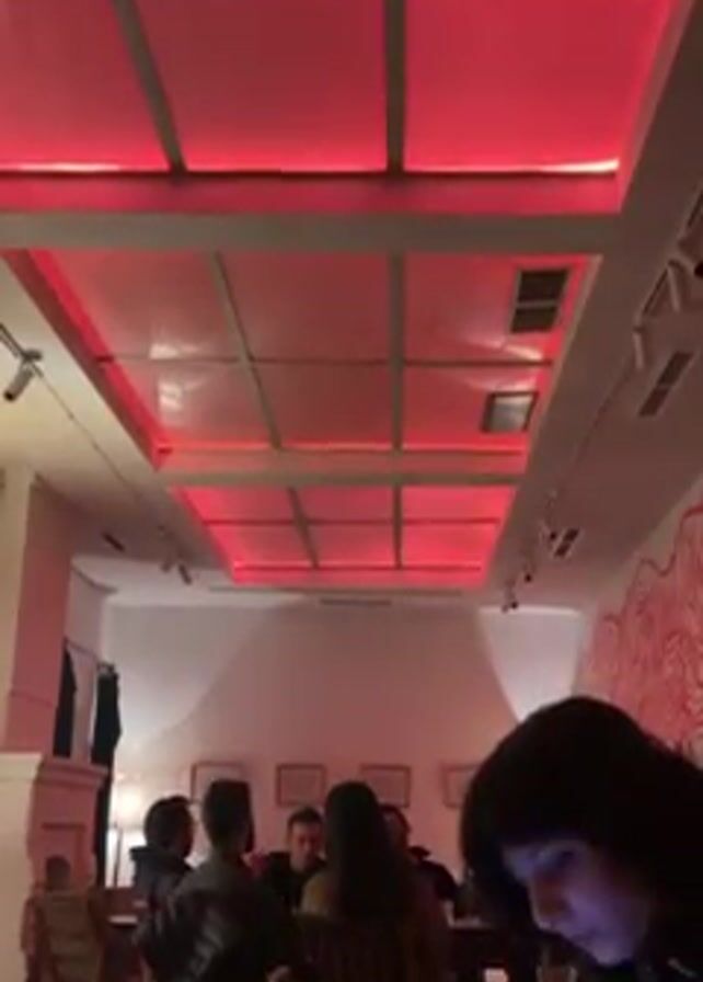 n interior scene with a group of people sitting at a table in a restaurant or cafe setting. The space is brightly lit, featuring a distinctive ceiling design with illuminated red panels. There are about six people visible at the table. Some are talking and interacting, while others appear to be listening. To the left, there’s a fireplace and some vintage-style furniture. On the right wall, there is what looks like a mural or decorative pattern. In the foreground on the right, a person with dark hair is looking down, possibly at a phone or a book. The overall atmosphere appears relaxed and conversational.