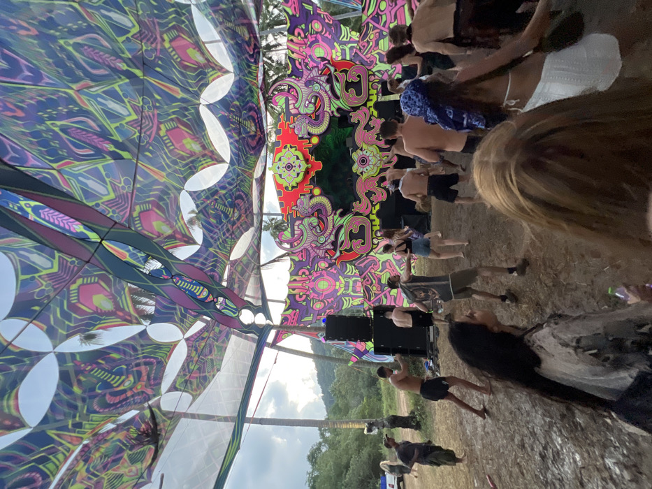 The image depicts an outdoor music event or gathering in Thong Nian, Thailand. The scene is characterized by a muddy, uneven dirt ground under a large, psychedelic-patterned fabric canopy suspended by poles. The canopy features intricate designs in shades of blue, green, pink, purple, and black. In the background, tropical palm trees and dense green foliage cover hills beneath a partly cloudy sky. At the center of the scene is a stage area adorned with a vibrant, symmetrical backdrop featuring complex psychedelic patterns in neon green, pink, red, and purple. Stylized dragon or serpent-like motifs flank a central circular design. Two large, dark speaker stacks are positioned on either side of this decorative panel. Approximately 20 to 30 individuals are visible, primarily young adults, most of whom are actively dancing or moving in the foreground and midground. Many men are shirtless, wearing shorts. Women are dressed in light attire, including shorts, tops, and one woman in a white crochet bikini top with a blue patterned headscarf. Some individuals are barefoot, while others wear shoes. On the far left, a white pickup truck is partially visible behind a dark, roughly sculpted totem or figure. In the immediate foreground, a woman with long dark hair wears a light-colored patterned shirt and holds a plastic bottle containing a purple liquid. Another woman with long brown hair is partially visible in the right foreground.