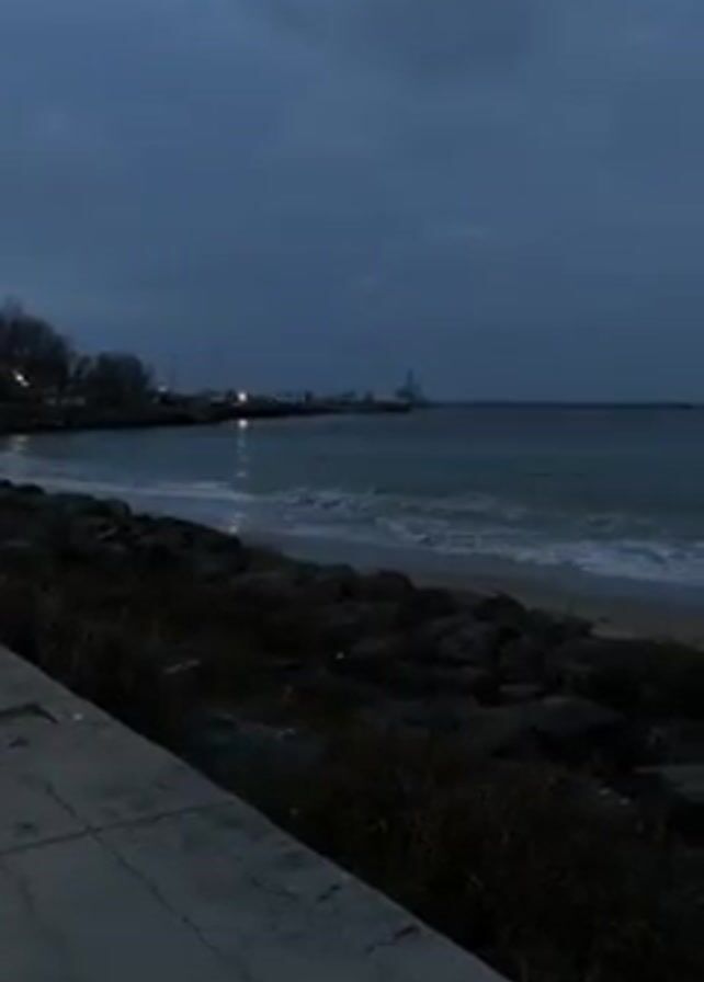 coastal scene on a cloudy, overcast day, likely at dusk or dawn. A calm sea with small waves laps against a sandy beach protected by a rocky barrier. In the distance, a structure or pier with lights can be seen extending into the water. A concrete walkway runs along the edge of the scene in the foreground. There are no people visible in the video.
