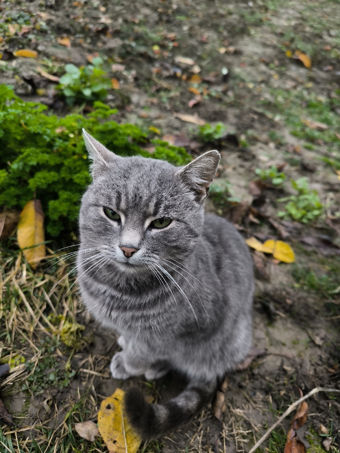 A grey tabby cat is seated on natural ground in Parkhomivka, Ukraine