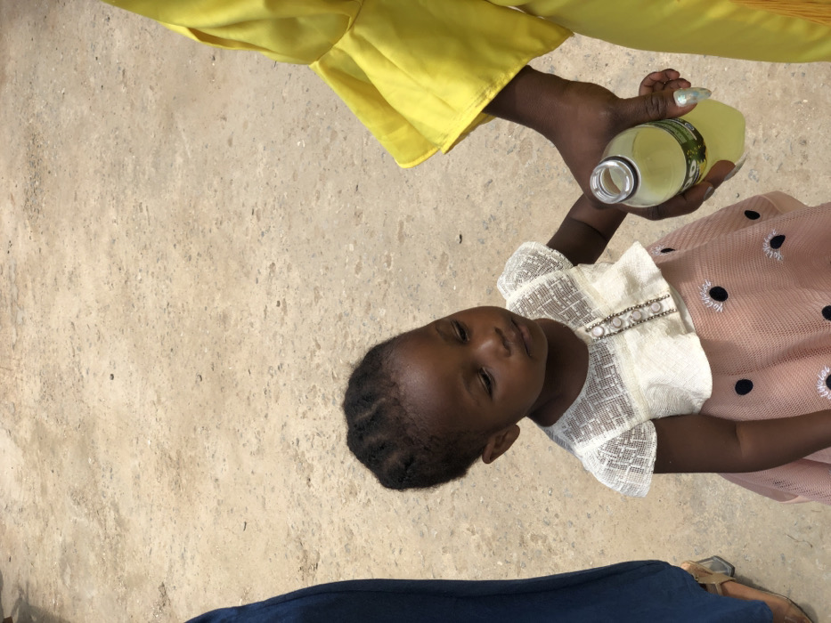 The image depicts a close-up, high-angle view of a young Black child alongside partial views of two adults, positioned on an unpaved, light brown or beige dirt ground with scattered debris, located in Weija, Ghana. The central subject is a young child with dark skin and hair styled in cornrows. The child wears a two-piece dress: a cream-colored, short-sleeved top with a textured, open-weave pattern and a vertical line of decorative buttons, and a light pink skirt with black polka dots and white embroidered details. The child's gaze is directed towards the right side of the frame and slightly downwards. To the left, a portion of a dark blue garment and a brown sandal with a chunky heel are visible. To the right, a dark-skinned arm and hand extend from a bright yellow, ruffled or bell-sleeved garment. The adult's hand holds a clear plastic bottle containing a light yellow liquid, possibly a beverage. The bottle is open, with a white cap ring visible at its neck. The adult's fingernails are long and manicured with an iridescent polish. The bottle is held near the child, but no direct interaction between the child and the bottle or the adult's hand is observed in this moment. The setting is outdoors under natural light.