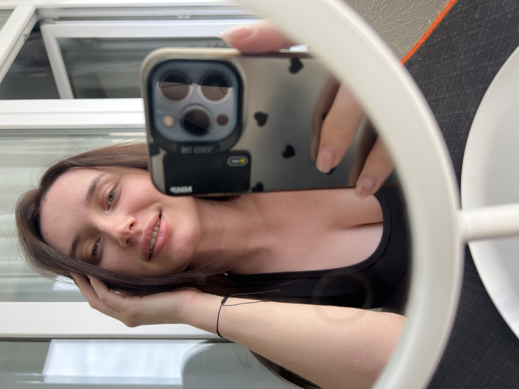 A selfie shows a young woman with long brown hair, fair skin, and hazel eyes, smiling slightly, holding a phone with a black case decorated with small hearts in front of her face in a mirror. She is wearing a black tank top and a delicate black string bracelet on her left wrist. The background shows an open window with white frames and what appears to be an exterior balcony or terrace, with a dark gray surface visible. The location is potentially in Tyumen, Russia, based on additional context.