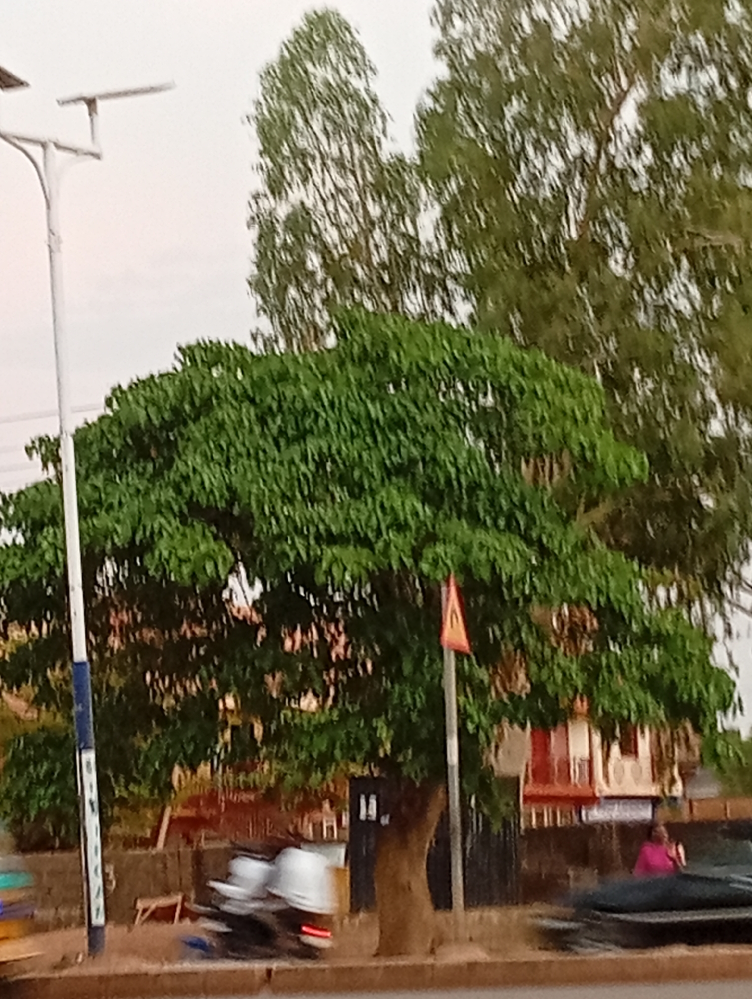 The image presents a blurred street scene in Sabon Tasha, Nigeria. A brown road surface occupies the foreground, exhibiting motion blur consistent with moving vehicles. On the left, a white pole with a blue base rises, topped by a grey apparatus supporting two horizontal panels, indicative of a solar-powered streetlight. A large tree with dense, dark green foliage is centrally positioned in the mid-ground. To its right, a thinner pole displays a red-orange triangular sign. Behind the central tree, architectural structures are visible, including one with a red upper facade and lighter-colored elements. At road level, to the left of the triangular sign, a motorcycle, appearing white and dark, is captured in motion, featuring two white, rounded objects resembling helmets. Further to the right, a person wearing a bright pink top is partially visible, seemingly seated or leaning near a dark, blurred vehicle. The background consists of additional trees with green foliage under a light grey sky.