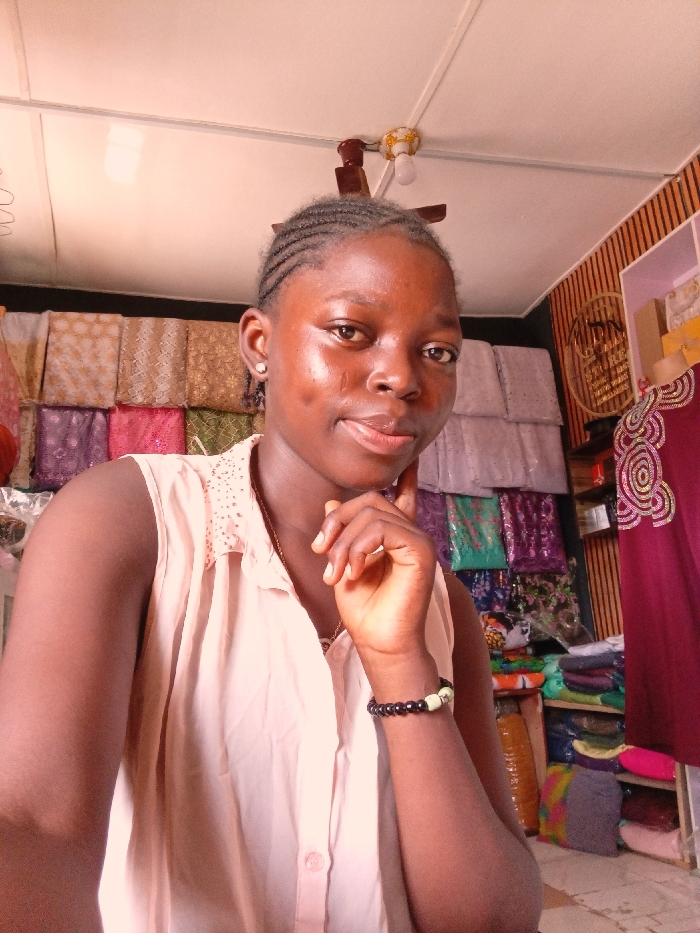 - "A young female subject is depicted in a medium shot, positioned indoors within what appears to be a textile or fabric shop located in the city of Ayob, Nigeria" by FM-ccdMm1, licensed under CC BY 4.0