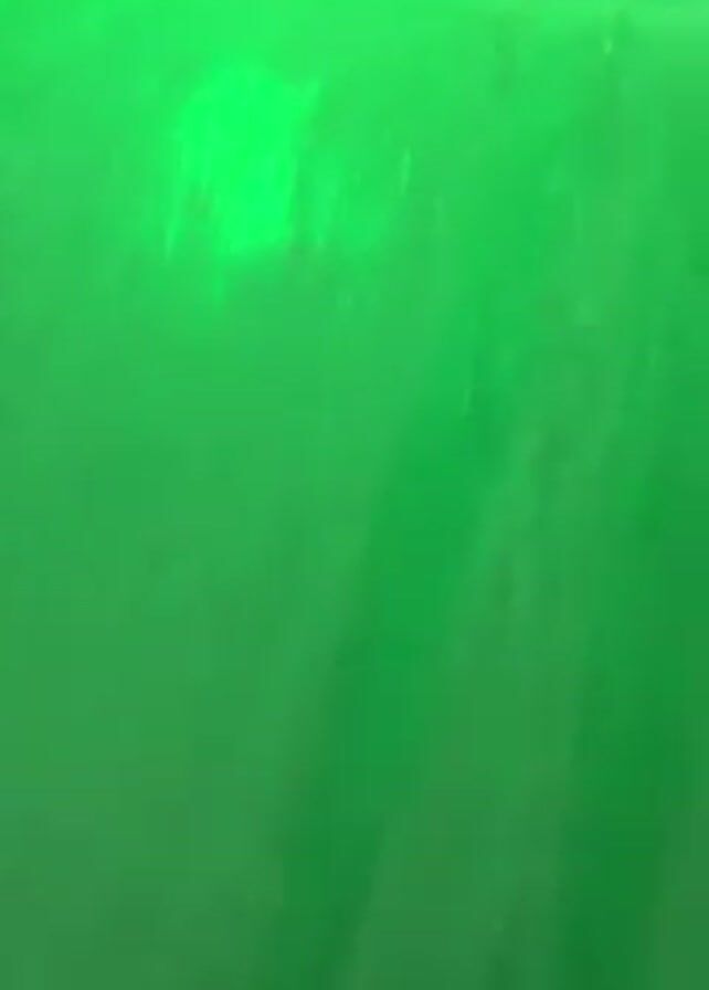 person ice skating on an outdoor rink at night. The rink is lit up with green lights, which transition to white lights later in the video. The camera faces forward as the skater moves along the ice. Two people are skating ahead. There are snowy banks along the sides of the ice path. The scene is somewhat blurry.