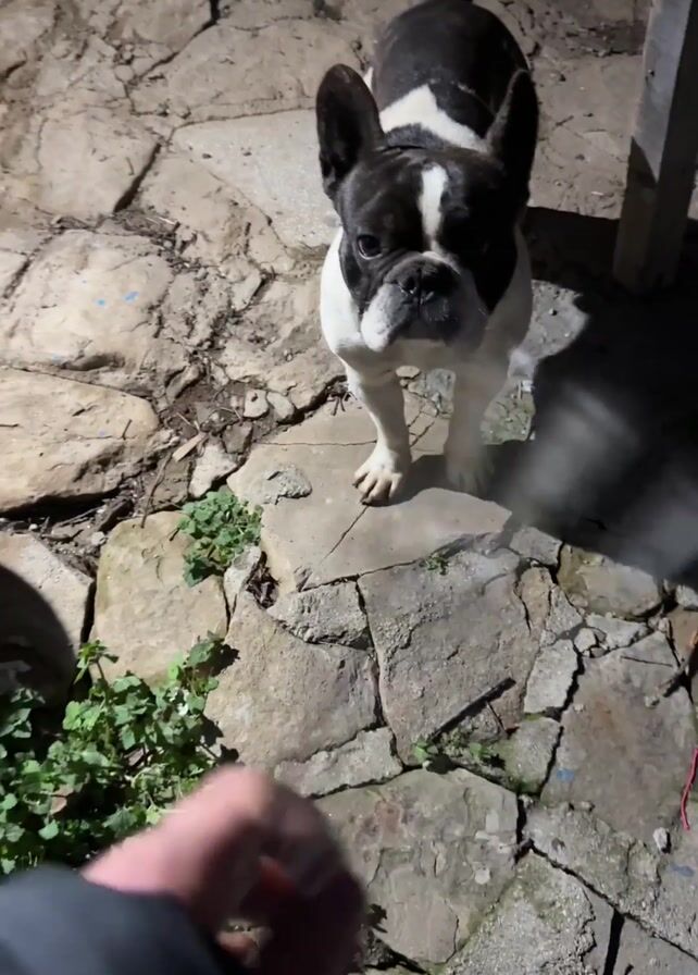 A French Bulldog, mostly white with black patches on its head and back, stands on a stone-paved area outside in the dark. A hand holding a small, silver object approaches the dog. The object is shaken, producing a rattling sound. The dog responds by tilting its head and looking at the object.