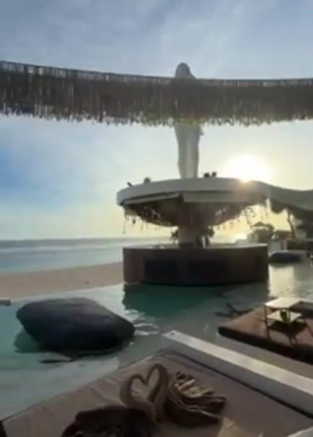 The video begins with a wide shot of a luxurious beachside resort. The scene features an infinity pool with daybeds and a unique sculptural installation resembling a fountain with a white figure on top. The sun is shining brightly, creating a hazy glow. The camera then pans to the left, showing the beach and the ocean in the background. Next, the camera angle shifts to capture a young woman in a black bikini. She turns towards the camera, smiling and posing slightly. The background shows the resort’s architecture, which includes thatched roofs and decorative elements made of natural materials. The setting conveys a sense of relaxation and high-end travel.