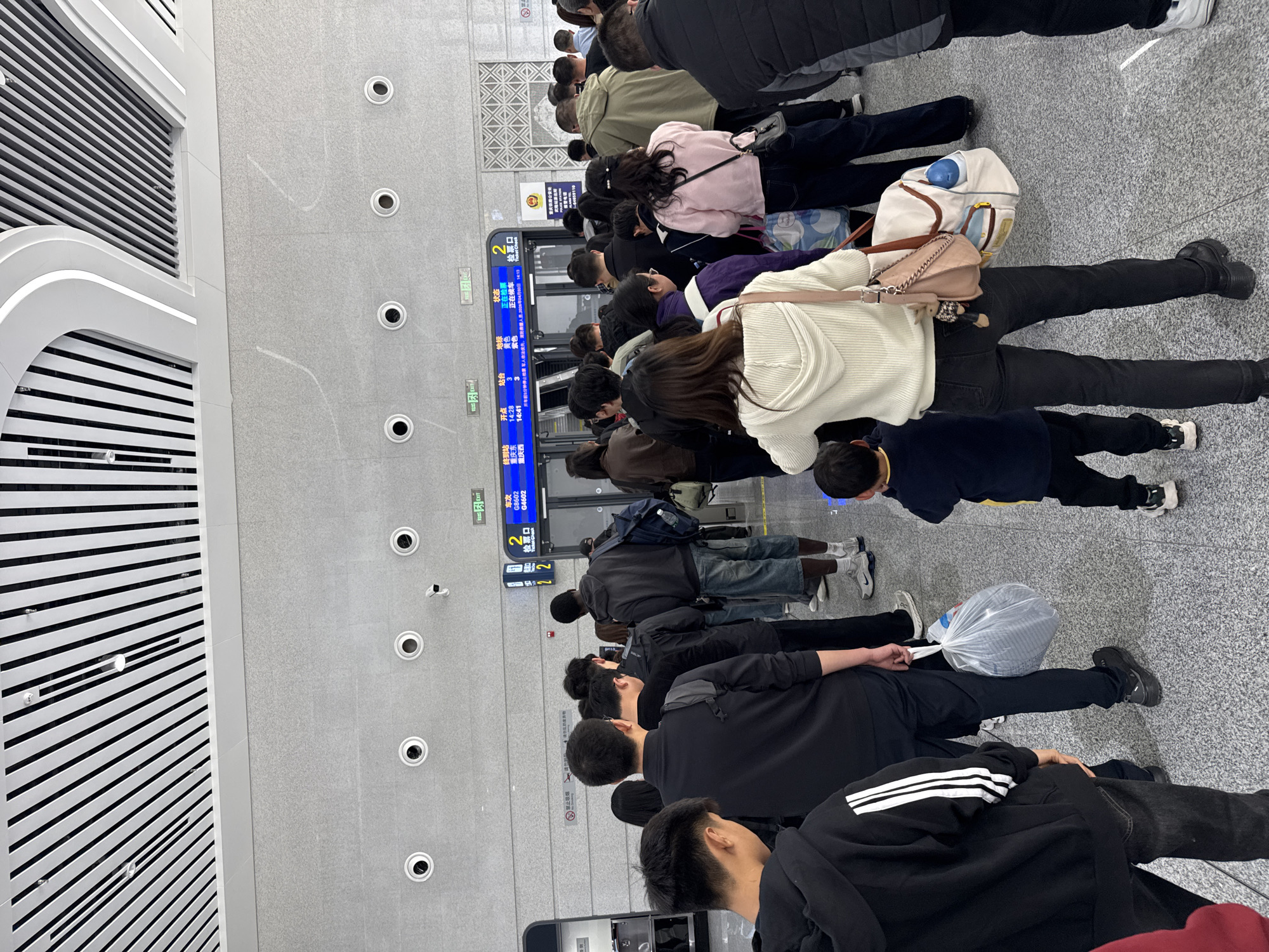A line of people is standing in front of a gate in a transportation hub. The passengers stand in front of an electronic display, indicating that Gate 2 is for train G8602 to Chongqing East, departing at 14:28 from Platform 3 and train G4602 to Chongqing West, departing at 14:41 from Platform 3. Some passengers have bags and luggage with them. The scene is set in an interior space in Wulong District, China.