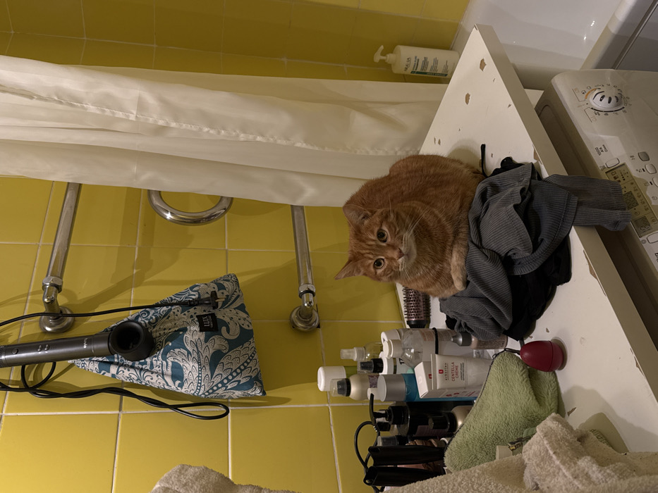 The image displays a domestic bathroom interior located in Moscow, Russia. An adult orange tabby cat is centrally positioned, sitting in a loaf posture on a pile of dark, folded clothing on a white countertop. The cat's front paws are tucked, and its gaze is directed forward. The countertop, which shows multiple chips and abrasions revealing a darker material underneath, extends across the lower half of the frame. To the left of the cat, various personal care items, including bottles, sprays, and a container labeled "ERBORIAN CENTELLA CRÈME," are arranged. A pink, egg-shaped applicator is also visible. To the cat's right, a round hairbrush with pink bristles lies on the clothing. Further right on the countertop, a white pump bottle with a green label indicating "ARAVIA MILD TONING ACID" is present. In the far left foreground, a stack of folded towels, one green and one beige, is visible. The wall behind the countertop is tiled with bright yellow square tiles. A grey hair styling tool, equipped with a European Type F/E plug and power cord, hangs from an upper chrome towel rail. The tool is partially enclosed in a teal and white paisley patterned fabric bag labeled "LUX". A second chrome towel rail and a curved chrome grab bar are mounted below it. On the far right, a white shower curtain hangs, partially obscuring a bathtub. Beneath the countertop, a white front-loading washing machine, identified by its control panel with a rotary dial (set to 1000 RPM) and a digital display, is visible; the brand appears to be INDESIT.