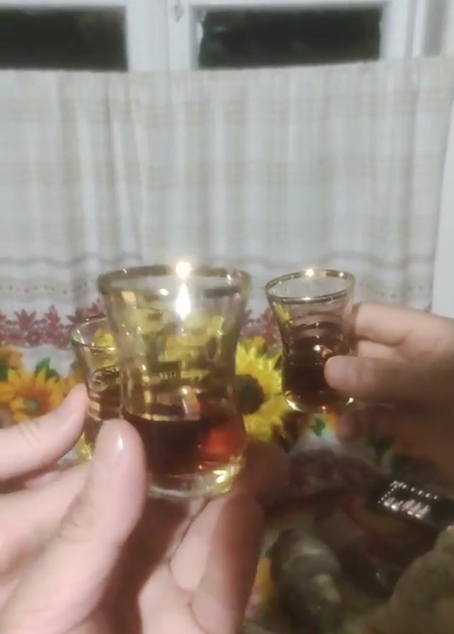 Three hands are shown holding glasses of dark liquid, possibly liquor. The glasses are short, ornate, and ringed with gold. They are in front of a table covered with a sunflower-printed tablecloth. There is a partially visible window with white curtains in the background. The people are toasting.