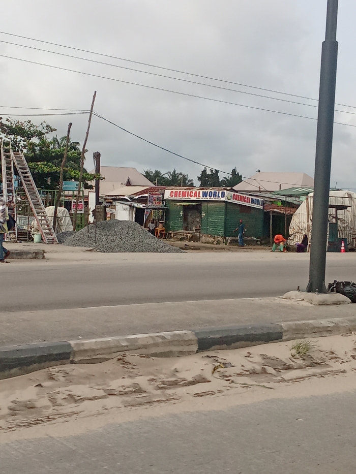 This image depicts a roadside scene in Lekki, Nigeria, under an overcast sky. The foreground shows an asphalt road with a faded white centerline, bordered by a curb painted in alternating black and white segments. Beyond the curb, a sandy and uneven dirt shoulder extends, featuring sparse patches of vegetation. On the far right, a tall, dark grey street light pole stands, with a black plastic bag or bags resting at its base and an orange traffic cone partially visible further right on the shoulder. Across the road, a large pile of grey aggregate material (gravel or crushed stone) dominates the midground. To its immediate left, two interconnected silver-colored ladders are propped against an unseen structure. Adjacent to the aggregate pile, on the far side of the road, are multiple commercial establishments. The most prominent is a building with a green corrugated metal facade, displaying multiple red-lettered signs that read "CHEMICAL WORLD." This structure appears to have two entrance points, one of which is boarded or closed. Smaller, less defined stalls or shelters made of corrugated metal and white tarpaulin are visible to the left and right of "CHEMICAL WORLD." Several individuals are present: * On the far left, a person wearing patterned clothing is partially visible, walking on the roadside. * To the left of the aggregate pile, a person is seated on a light-colored stool or object in front of a stall. * A man in a blue shirt and dark trousers stands near the "CHEMICAL WORLD" building. * On the far right side of the road, near the orange cone, two women are present. One is bending over, wearing an orange top and dark bottom, while the other is seated on the ground in a purple garment. In the background, beyond the immediate structures, trees and sparse vegetation are visible, along with the roofs of several buildings, indicating a mix of commercial and residential architecture. Overhead, multiple electrical wires or communication lines crisscross the frame. Two tall, bare wooden poles are visible behind the aggregate pile and near the "CHEMICAL WORLD" building.