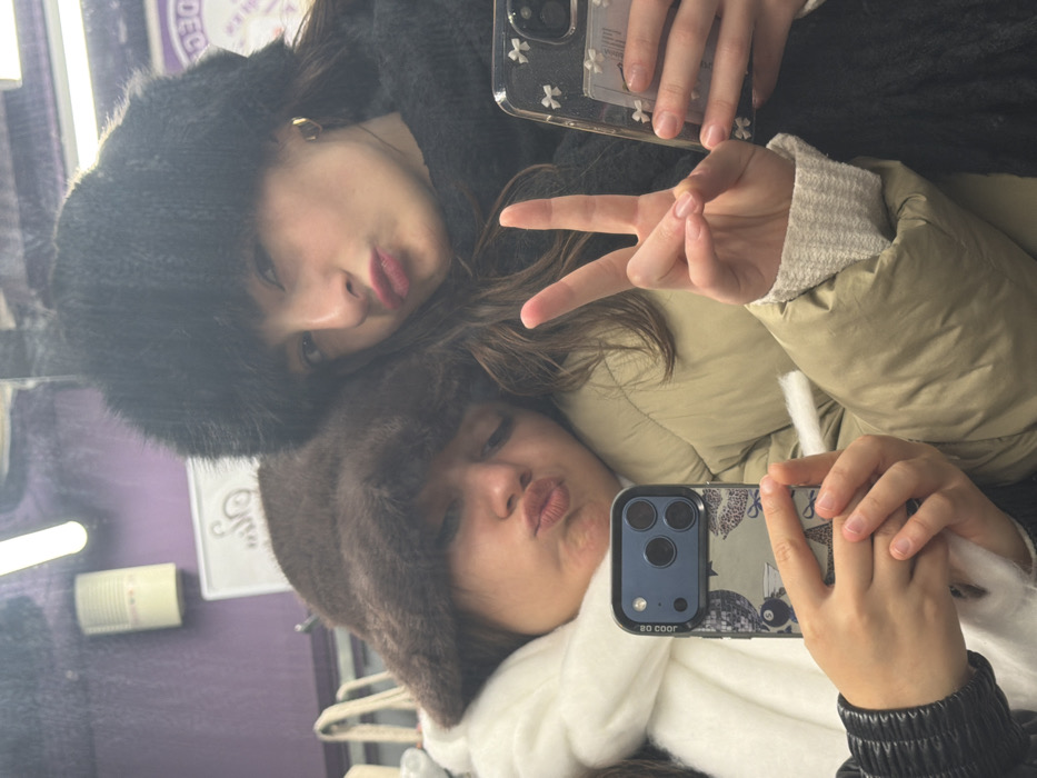 Two young females are depicted in a close-up, interior scene within the city of Strasbourg, France. The background features a muted purple wall, overhead fluorescent lighting, and a white rectangular vent. On the left, a female wears a brown faux-fur bucket hat, a white fluffy scarf, and a beige puffy jacket with a white ribbed cuff. Her lips are puckered in a "duck face" expression. She holds an iPhone with a blue frame, three rear cameras, and a patterned case featuring disco balls and lips. On the right, another female wears a black faux-fur hat, a black scarf, and small gold hoop earrings. Her lips are also puckered, and her left hand forms a peace sign. She holds an iPhone in her right hand, which has a clear case decorated with small white bows and a white card visible behind it. Both subjects are looking towards the camera, indicating a selfie or a posed photograph.