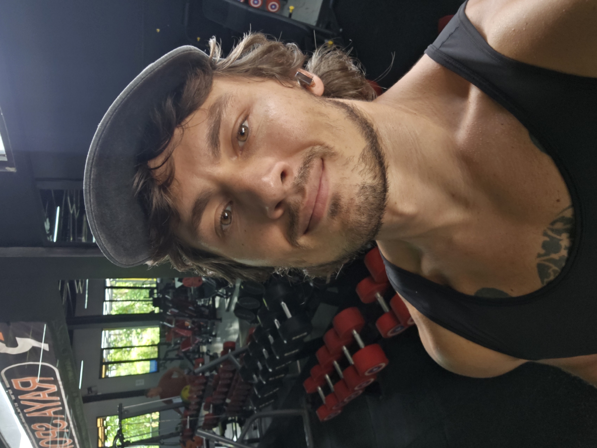 - "A gym selfie shows a man with light brown hair and a short beard, wearing a black tank top and grey cap, looking into the camera" by FM-iFtzh1, licensed under CC BY 4.0