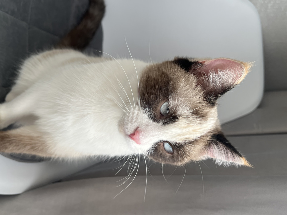 The image depicts a domestic cat seated in an indoor setting in Votkinsk, Russia. The cat exhibits a colorpoint pattern, featuring predominantly white fur on its chest and lower face, transitioning to dark brown markings around its light blue, slightly convergent eyes, on its ears, and across the bridge of its nose. Mottled brown and cream fur is present on its forehead. The ear tips are notably reddish-orange, with dark fur outlining the ear edges. A pink nose and prominent white vibrissae are visible. Its dark brown tail is partially visible on the left. The cat is looking towards the right side of the frame. It is seated on a dark grey, quilted surface. A light grey plastic or metal chair is visible behind the cat on the left, and an undifferentiated light grey surface, likely a wall or curtain, forms the background on the right. No human subjects or active interactions are depicted.