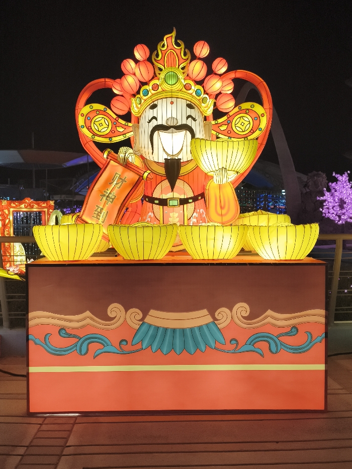 - "A large, illuminated lantern display depicting the Chinese God of Wealth, Caishen, stands prominently outdoors at night in the city of Coronel Gregorio Albarracín Lanchipa, Peru" by FM-HiOWA2, licensed under CC BY 4.0