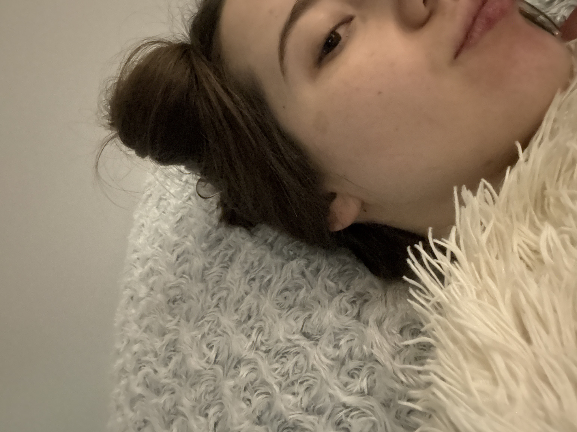 A person is lying down, with their head resting on a light blue fluffy pillow. The person has brown hair styled in a bun. A white, fluffy blanket is draped across their body. The person's face is partially visible, revealing an eye, part of the nose, and lips. The background is a plain, light-colored wall. The location is not evident.
