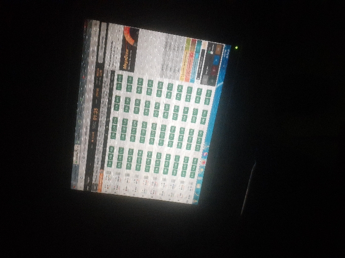 A monitor displays a Megadraw spreadsheet filled with numerous green cells containing numbers. The screen is illuminated against a dark background. The spreadsheet spans the majority of the display area, with menu bars and other application interfaces visible at the top. A power indicator light glows on the upper right corner of the monitor.