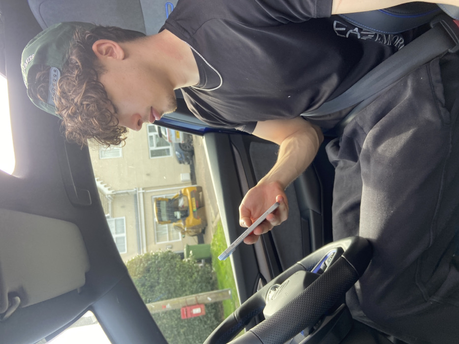 A young male is seated in the driver's seat of a vehicle on a residential street in Broxbourne, United Kingdom
