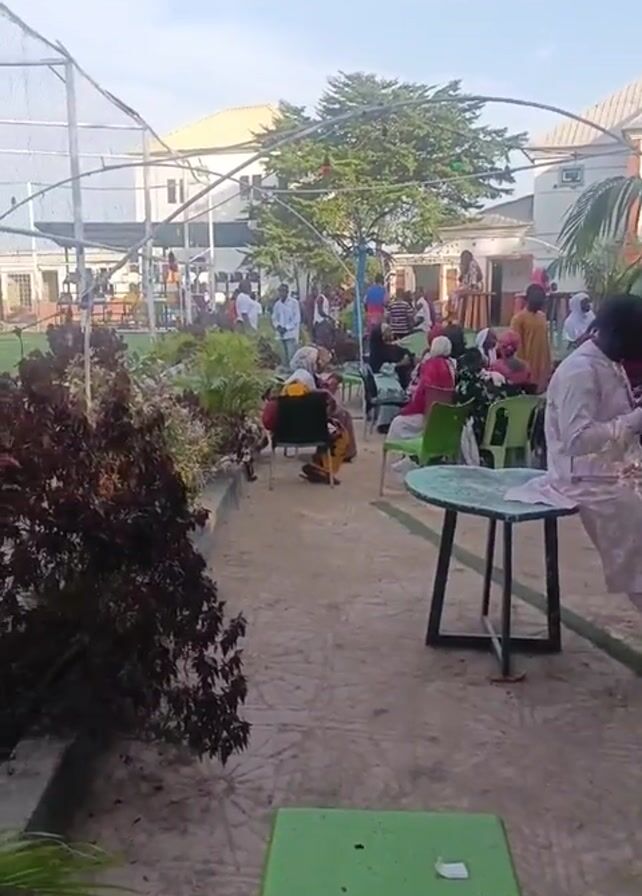 gathering of people outdoors, next to a fenced-in sports field. Most attendees are seated, although some people are walking around. The sports field has artificial turf. A sign on the fence reads “SPORTS ARENA.” There are small trees and plants scattered throughout the area where the people are gathered, and the trees in the background provide additional greenery. Some tables and chairs are set up for the people. The sky is light blue with some clouds visible.