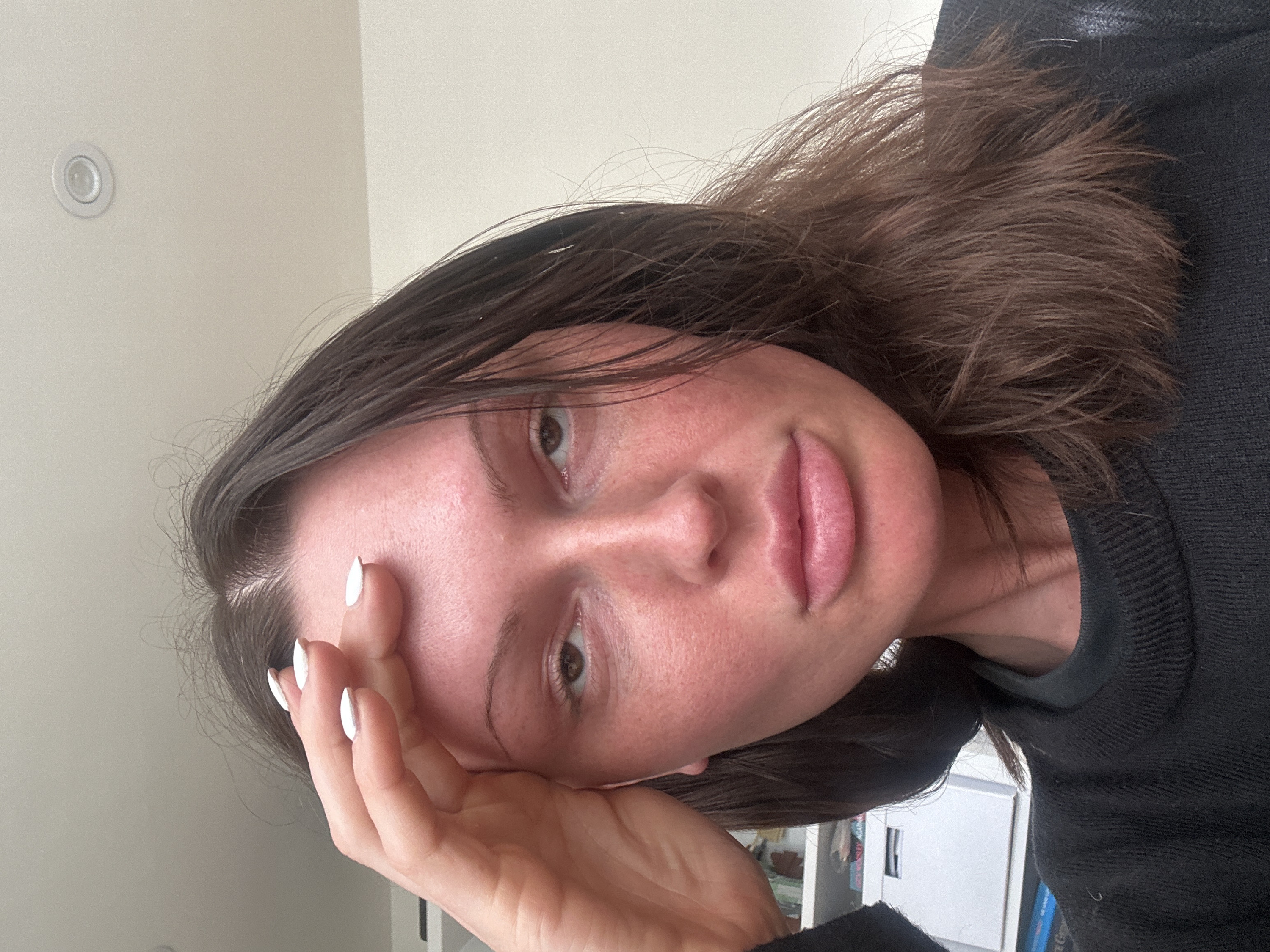 An indoor scene, situated in Wealden, United Kingdom, depicts a female individual from the chest up, facing forward. The individual has dark brown hair, which appears long and somewhat disheveled, parted near the center. Her skin, particularly on the face, exhibits a reddish, flushed appearance with visible texture. Her eyes are brown, with visible dark circles beneath them, and her eyelids are slightly lowered. Her lips are full, naturally pigmented, and slightly parted. The individual's right hand is raised, with four fingers resting against her forehead. The fingernails on this hand are manicured and painted white. She is wearing a dark, possibly charcoal or black, knitted garment with a ribbed collar. The background consists of a plain, light-colored wall. A white recessed light fixture is visible on the ceiling in the upper right portion of the frame. To the subject's left (viewer's right), a partial view of white shelving or drawers is visible, containing indistinct objects.