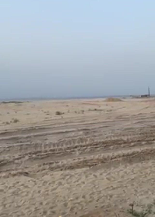 sandy beach. There are tire tracks in the sand and piles of sand. There is trash on the beach, including a plastic bottle. In the distance, there is a body of water and what appears to be a structure. There is also music playing in the background.
