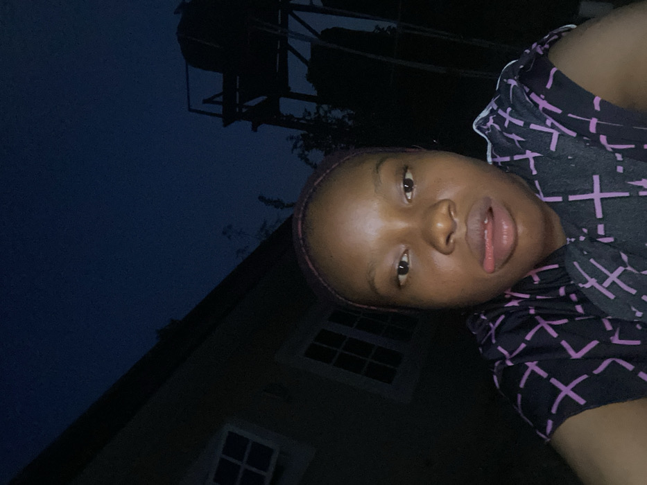 A woman poses in the dark. She wears a black and purple shirt. Behind her is a building and a water tower. The sky is dark blue. The image is dimly lit, making details difficult to discern.