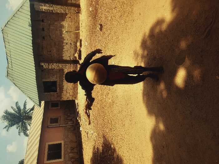 The image depicts an outdoor scene in Akwanga, Nigeria, under bright daylight conditions. A single child, seen from behind and partially silhouetted, is positioned centrally, facing away from the viewer. The child, barefoot, wears dark long-sleeved attire with dark pants featuring vertical light-colored stripes on the sides. The child's right arm is extended backward, holding a light-colored, spherical object, consistent with a ball. The left arm is extended forward. The ground consists of dry, reddish-brown dirt and small pebbles, with multiple dark shadows cast upon it, indicating strong sunlight from the right side of the frame. In the background, two single-story structures are visible. The building on the left features a peach-colored exterior with a lower stone foundation, a light-colored corrugated metal roof, and two rectangular windows. The building on the right, closer to the foreground, appears unfinished, constructed from rough concrete blocks, with an open window aperture and a green corrugated metal roof. A tall palm tree is visible between the two buildings. The sky is a pale blue with scattered white clouds.