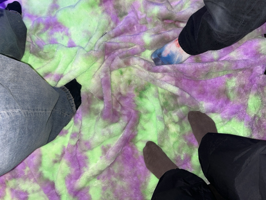 A lime green and purple tie-dye blanket is partially visible, featuring three sets of legs and feet
