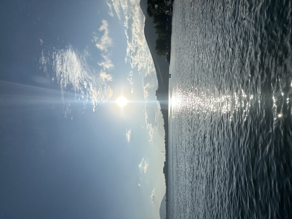 The image captures a wide-angle outdoor scene on Lake Sevan, Armenia. The sky, occupying the upper portion, is predominantly clear blue with scattered white cumulus clouds, primarily in the upper right quadrant. A brilliant sun is positioned in the upper-right, emitting strong light rays and creating a distinct glare path across the water. The lower portion of the image is dominated by the dark, rippled surface of Lake Sevan, reflecting the sun's light as a shimmering streak extending from the horizon towards the foreground. In the mid-distance, two dark, indistinct shapes, appearing to be small watercraft, are visible on the lake. The background features distant landmasses. To the far left, hazy hills or mountains are visible on the horizon. On the right mid-ground, a prominent land formation rises, featuring the distinct architectural outline of the Sevanavank Monastery on an elevated position. Further to the right along the shoreline, trees and a cluster of small structures are present. The scene is brightly illuminated by natural sunlight.