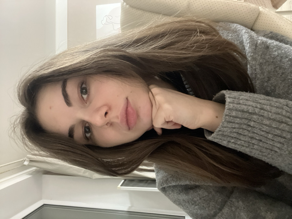 The scene is set in an indoor environment in Saint Petersburg, Russia. A young adult female is depicted in a frontal, close-up shot, extending to her upper torso. She has long, dark brown hair parted centrally, which frames her face. Her eyes are open and directed towards the viewer, and her facial expression is neutral. Her right hand is positioned with fingers curled, supporting her chin and jawline. She is wearing a grey, knitted sweater with visible texture and ribbed cuffs, covering a dark, possibly black, garment underneath. The background consists of a light-colored wall. To the subject's right, a cream or off-white chair with a distinctive perforated or quilted backrest is partially visible. To her left, a section of a white window frame and light-colored curtains are discernible, along with a portion of a framed object featuring a dark border. A minimalist line art drawing, depicting a profile of a human head, is visible on the wall behind and to the right of the subject's head.