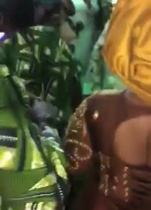The video depicts a group of women dancing at an indoor event. The women are dressed in colorful and patterned clothing, with many wearing traditional headwraps in green, yellow, and other colors. The setting appears to be under a tent or a covered area, decorated with fabrics and floral arrangements. The women are moving and dancing together, creating a lively and celebratory atmosphere.