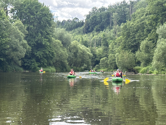 A group of people are kayaking down a calm river surrounded by lush green trees on both sides