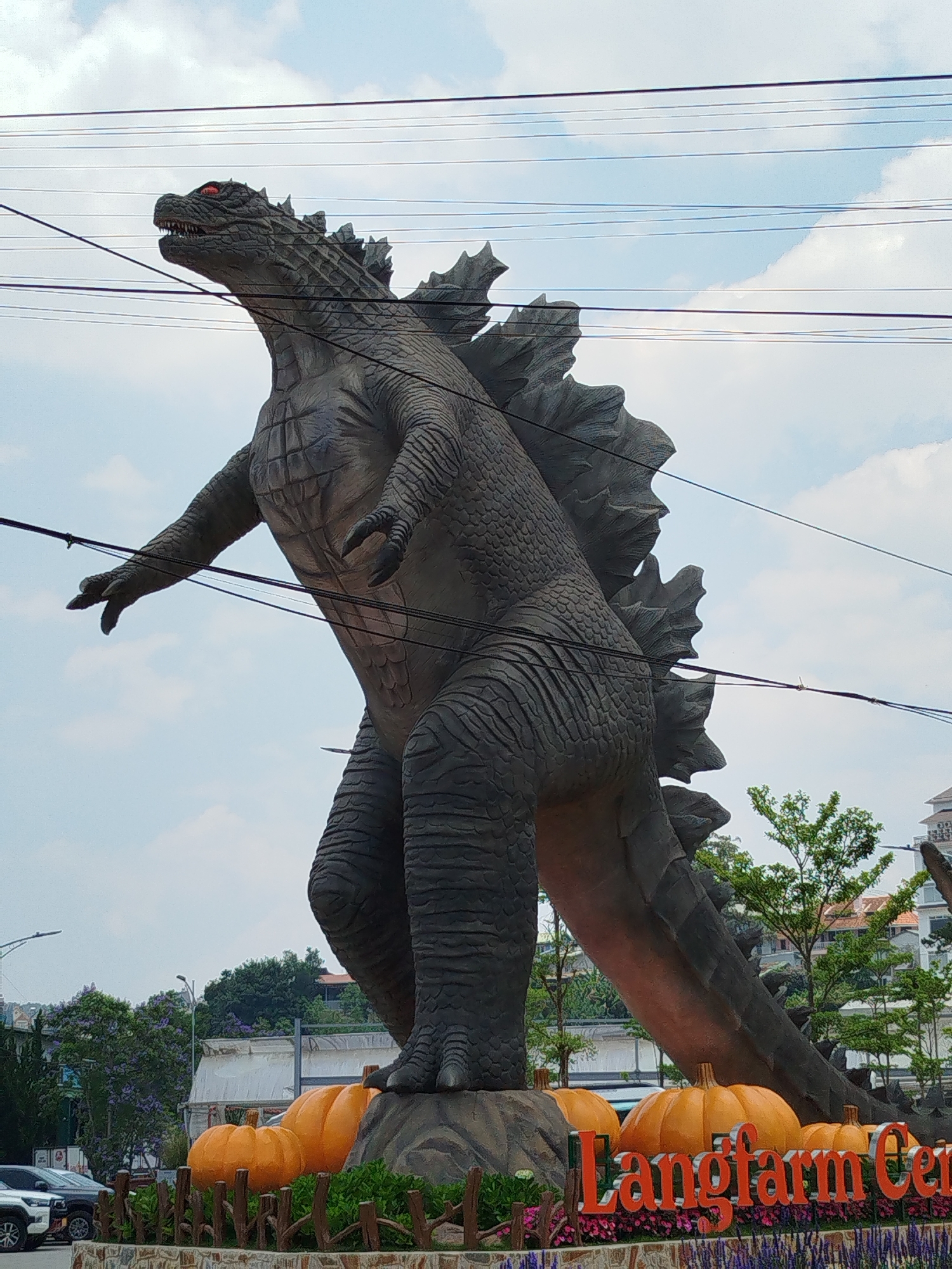 A large Godzilla statue stands in Cam Ly, Đà Lạt, Vietnam. The statue is gray, with red eyes and jagged dorsal fins. It stands on a rock platform surrounded by orange pumpkins. The words "Langfarm Center" are visible in front of the statue. Power lines crisscross the sky. Cars, buildings, and vegetation can be seen in the background. The sky is cloudy.