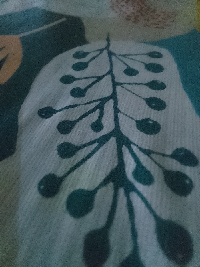The image displays a close-up, angled view of a patterned textile surface, described as being located in Meknes, Morocco. The central and dominant feature is a stylized botanical pattern consisting of a dark teal branch-like stem with numerous symmetrically arranged, ovular "berries" or "leaves" against a light grey, subtly textured fabric background. The textile exhibits a faint woven appearance. Ancillary design elements are partially visible: a segment of a muted orange, abstract leaf shape on a dark ground in the upper left quadrant, and a portion of a reddish-brown, textured pattern in the upper right. A solid block of teal color is also visible along the right edge. No individuals are present, and no actions or interactions are depicted within the static, indoor scene, which appears to be under subdued lighting conditions.