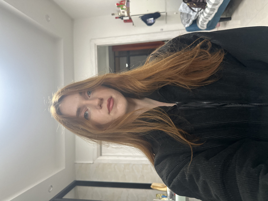 - "A young adult female with long, wavy, reddish-brown hair and light-colored eyes is depicted in a chest-up, frontal portrait within an interior room located in Yiwu, China" by FM-9iDyv1, licensed under CC BY 4.0