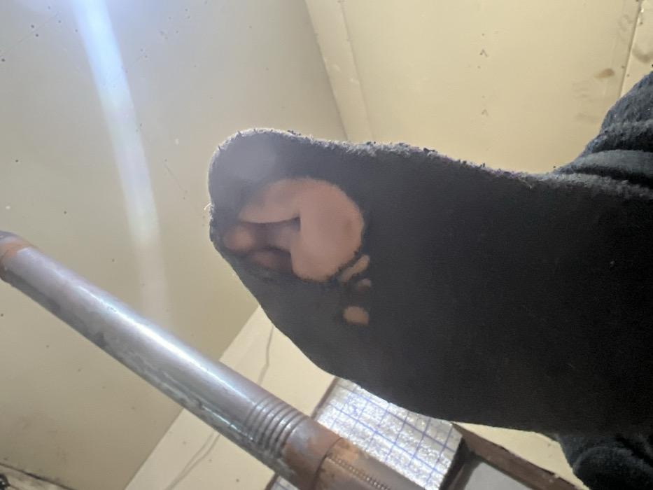 A close-up, low-angle shot depicts a black sock with a hole exposing toes. A corroded, silver pipe runs diagonally across the left side of the frame. The background features a lightly colored wall, a window with a grid pattern, and indistinct elements. The sock's hole reveals the skin tone of the toes, creating a focal point. The overall image is gritty, with visible textures and imperfections.