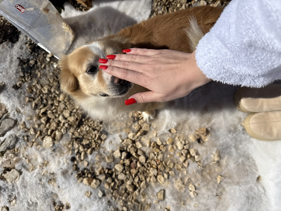 The image depicts an outdoor scene in Motički gaj, Montenegro, under clear daylight with visible shadows. A light-skinned hand, featuring red nail polish on all visible fingers, is shown interacting with a small, light brown and white dog. The hand is positioned against the dog's muzzle and forehead. The dog has dark eyes and a dark nose, with fur variations of light brown on its back and head, and white on its chest and face. Below the interaction, the person's feet are visible, clad in beige, soft-material footwear. A white, textured, fluffy sleeve, likely belonging to a robe or jacket, is also visible on the lower right, partially covering the wrist area of the hand. The ground is a mixture of melting snow or ice and light-colored gravel, suggesting a cold environment transitioning to warmer conditions. A translucent plastic container, branded "BrainQ," is partially visible in the upper right background, resting on the ground. The lighting is strong, casting distinct shadows from the subjects onto the snow-covered ground.