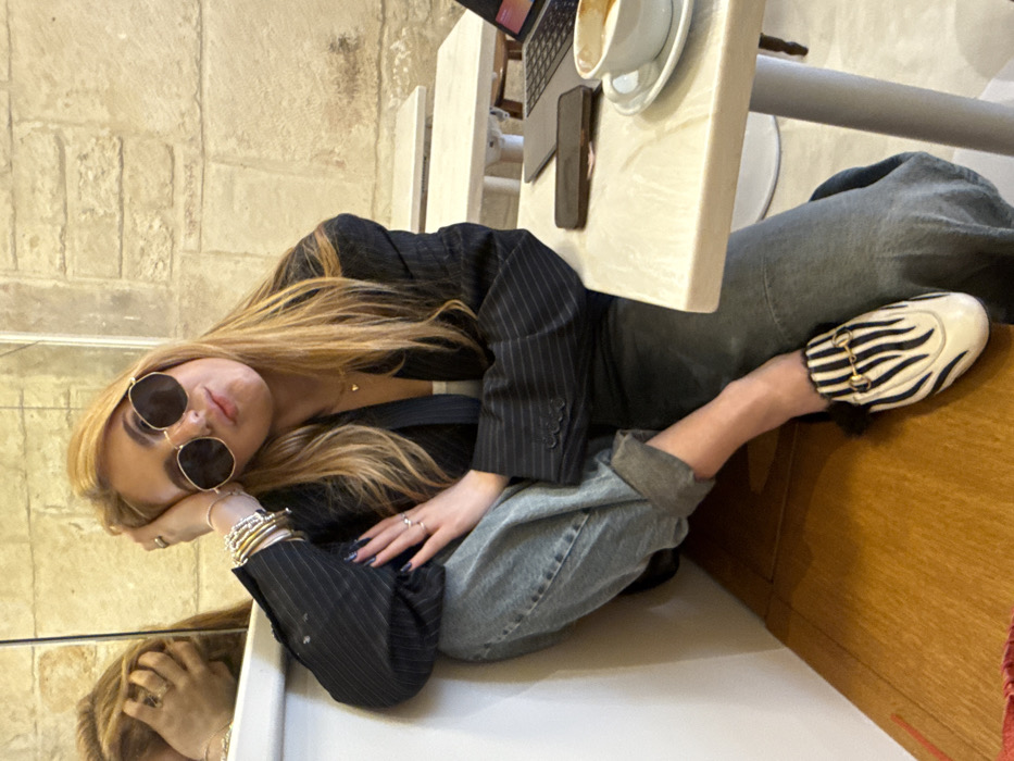 The image portrays an individual inside a cafe, consistent with the architectural style found in older districts of Paris, France. A young person with long blonde hair, wearing large, round, dark-lensed sunglasses, a dark pinstriped blazer, light-wash cuffed jeans, and a single white and black zebra-print loafer, is seated on a wooden bench. Multiple silver bracelets adorn the left wrist, and rings are visible on several fingers of both hands. The individual poses with their left elbow resting on the bench back, supporting their head with their left hand, while their right hand rests on their knee. On a white, marble-topped table in the foreground, a white cup and saucer containing partially consumed coffee, a dark smartphone, and an open silver laptop are present. The background features light-colored, rough-hewn stone walls and an additional white table, contributing to the cafe environment. A mirror to the left reflects a portion of the individual's head and arm.